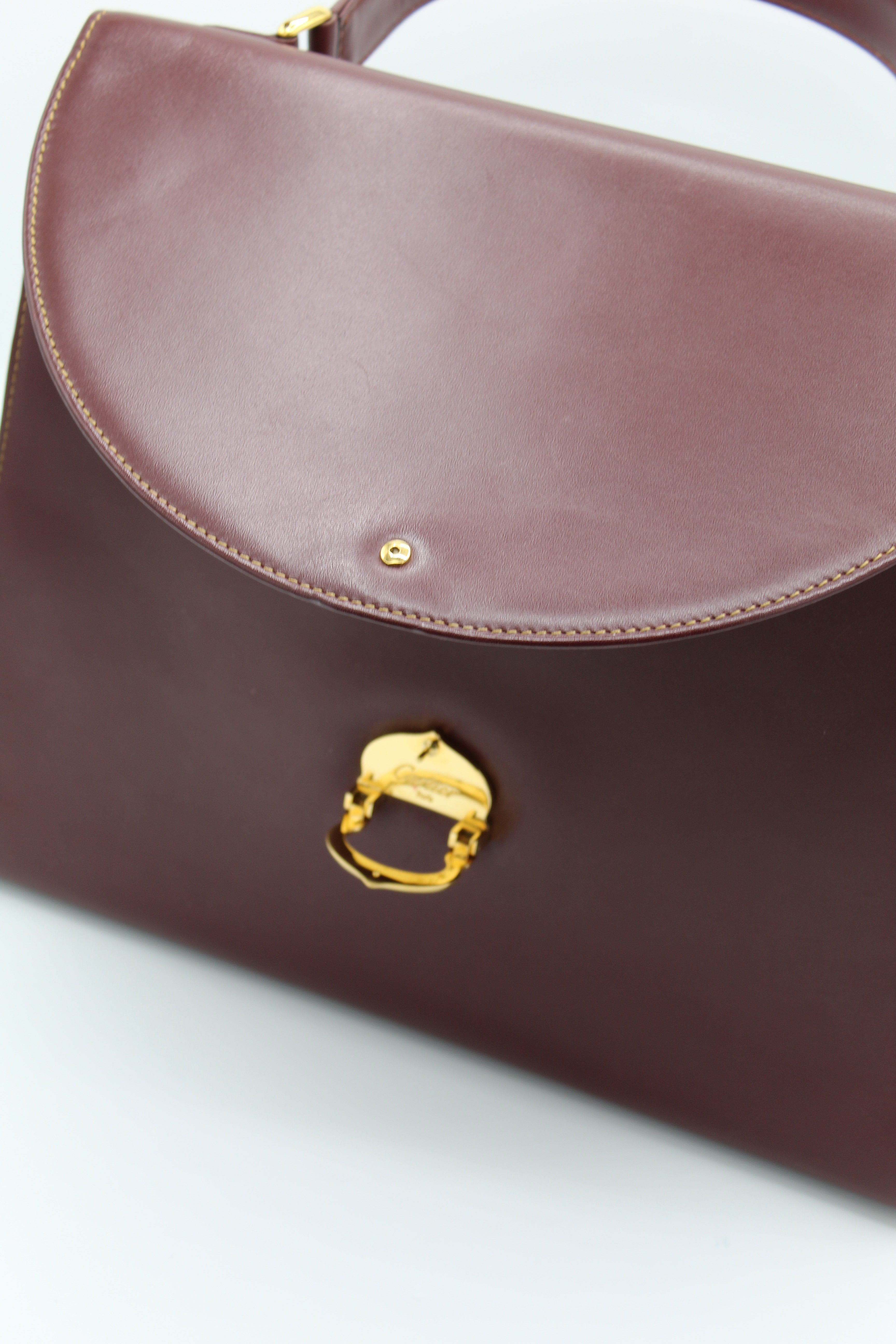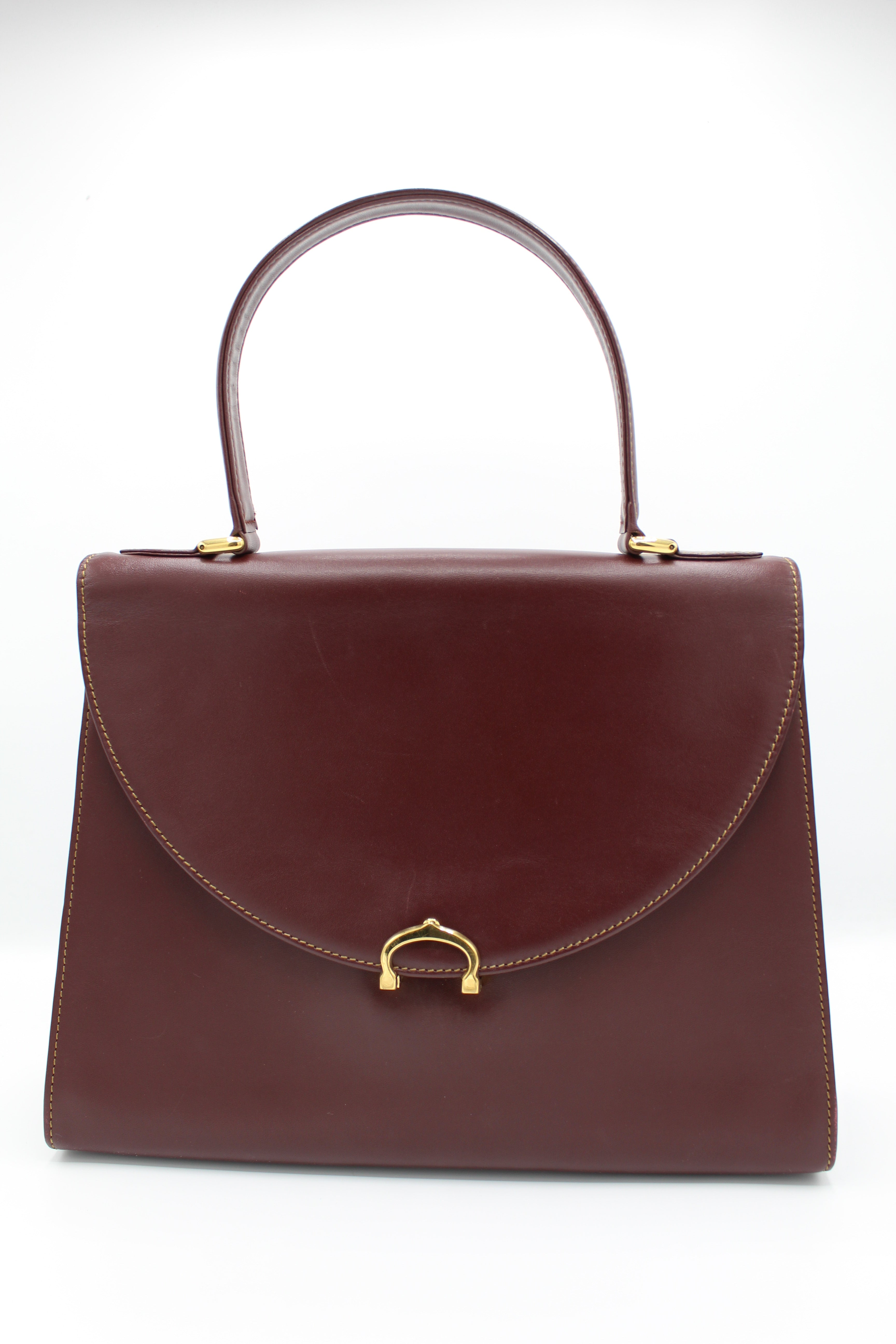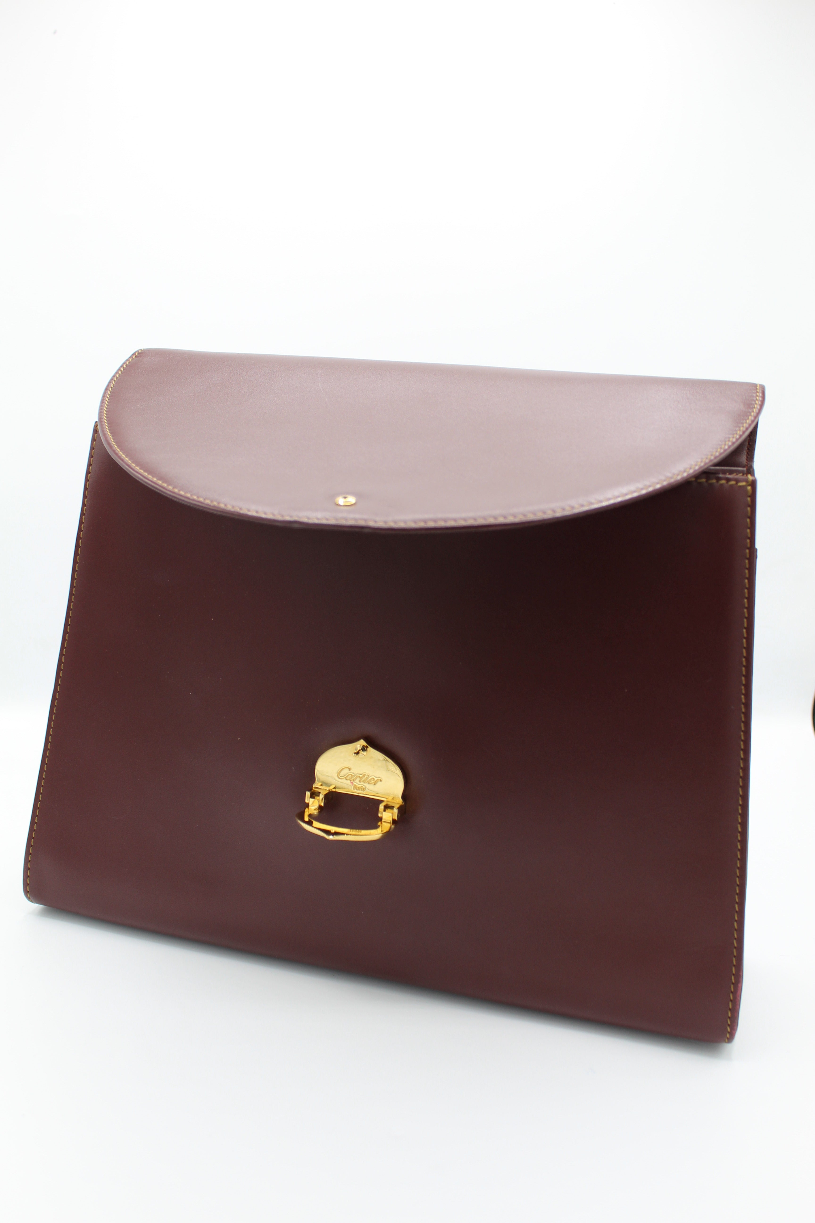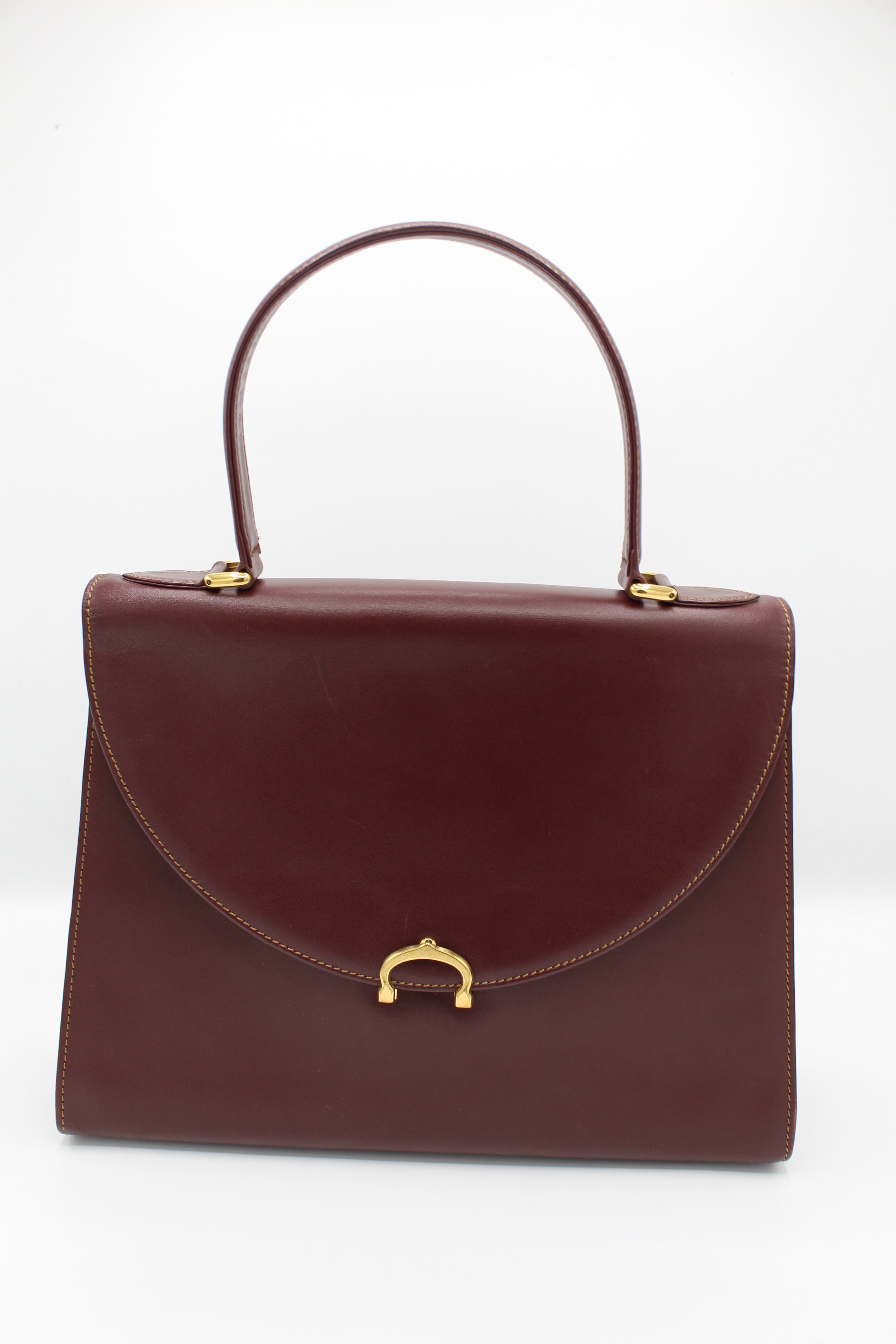 A refined vintage piece from Cartier’s Must de Cartier line, this structured top-handle bag is crafted from smooth burgundy leather and finished with elegant gold-tone hardware. The curved flap and signature clasp detail reflect the house’s timeless approach to luxury design.