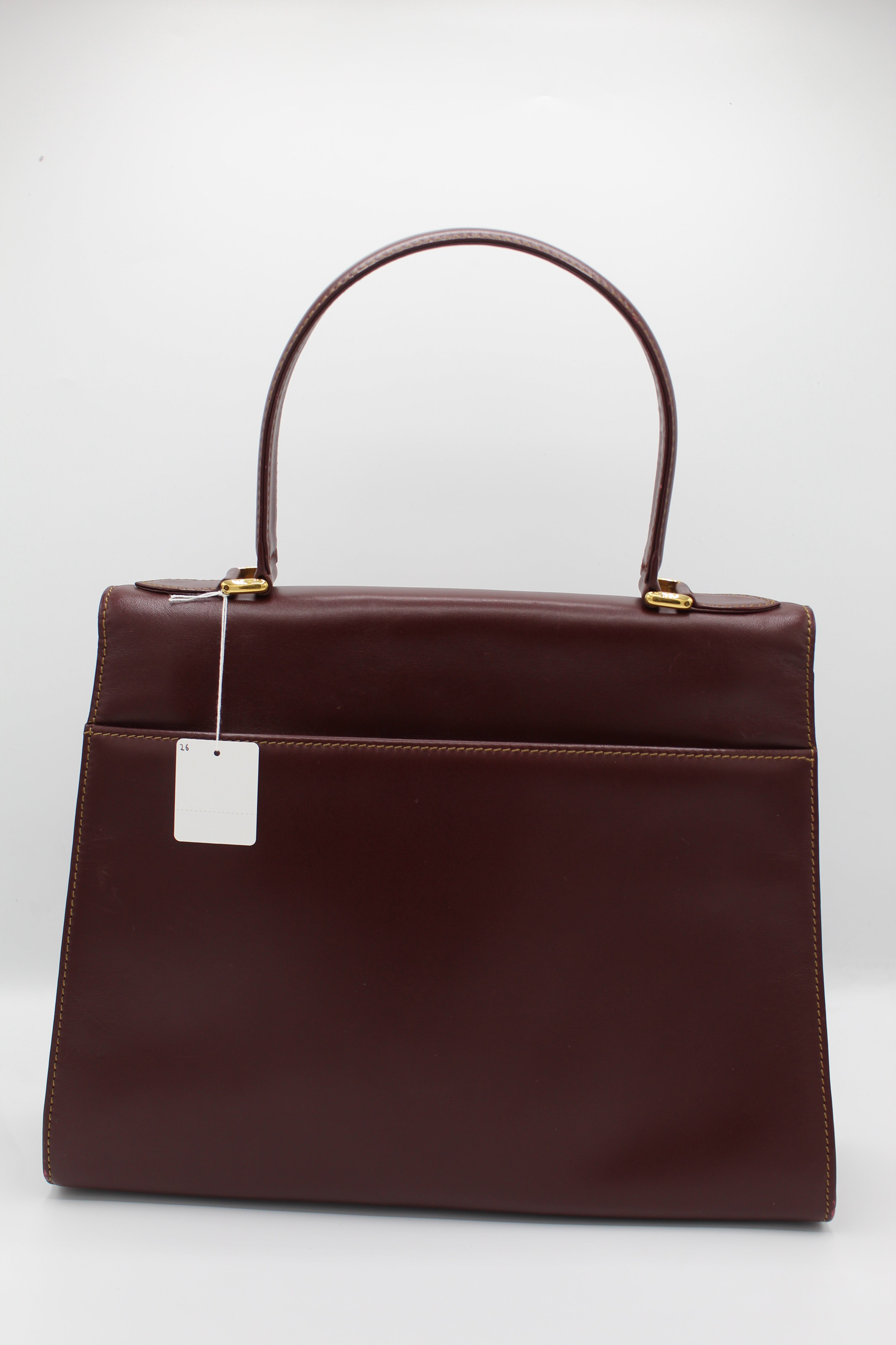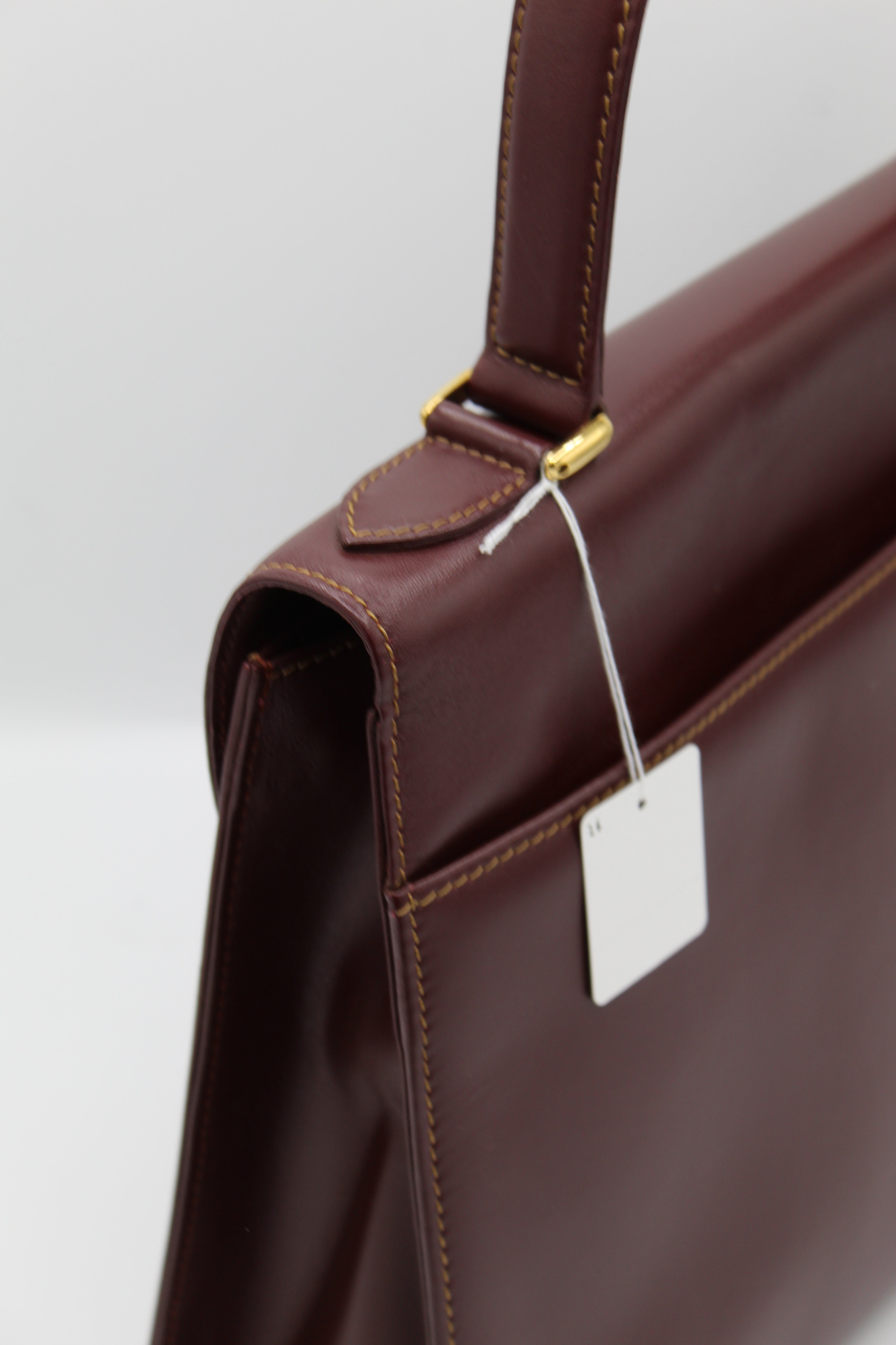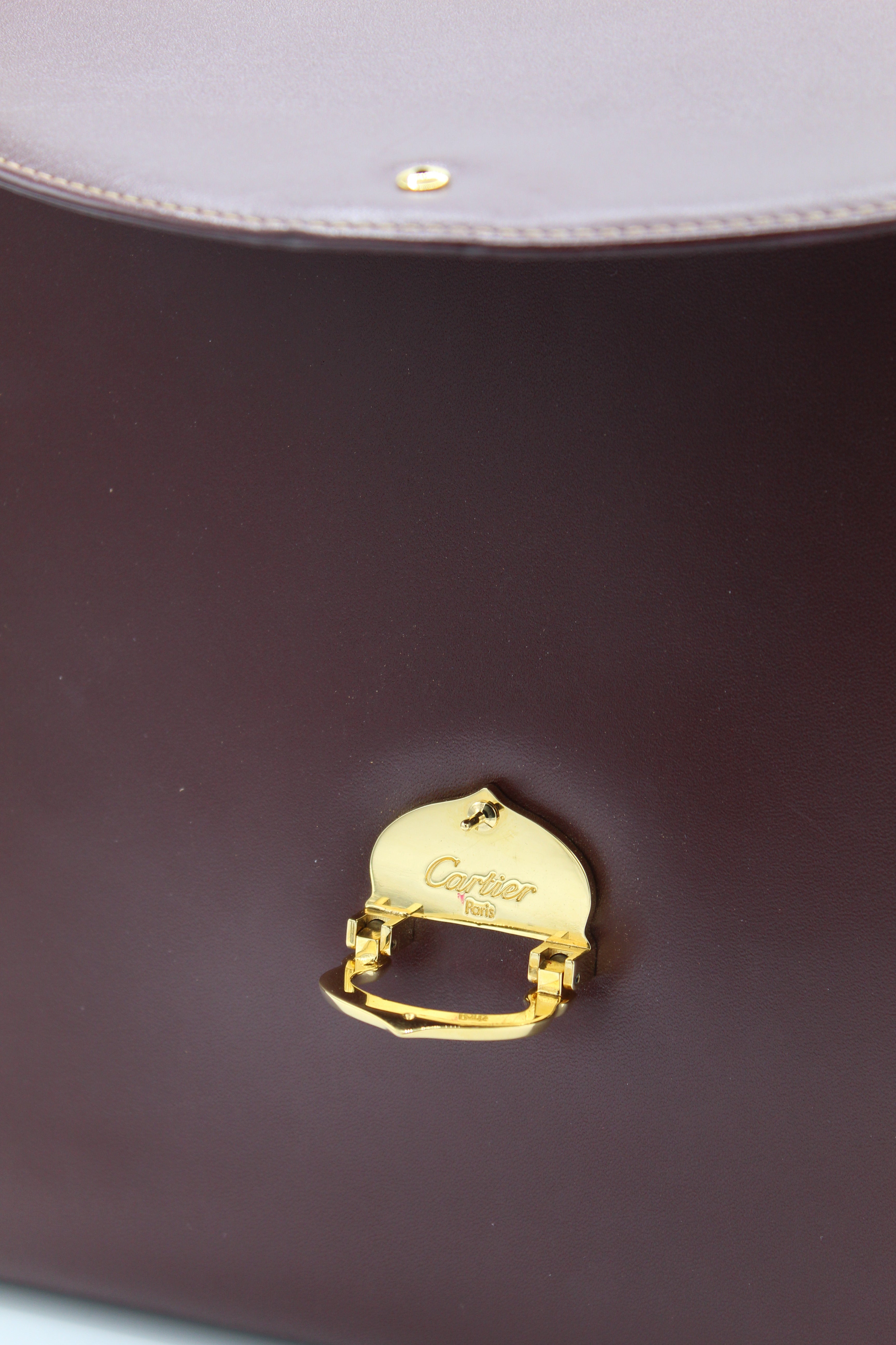 A refined vintage piece from Cartier’s Must de Cartier line, this structured top-handle bag is crafted from smooth burgundy leather and finished with elegant gold-tone hardware. The curved flap and signature clasp detail reflect the house’s timeless approach to luxury design.