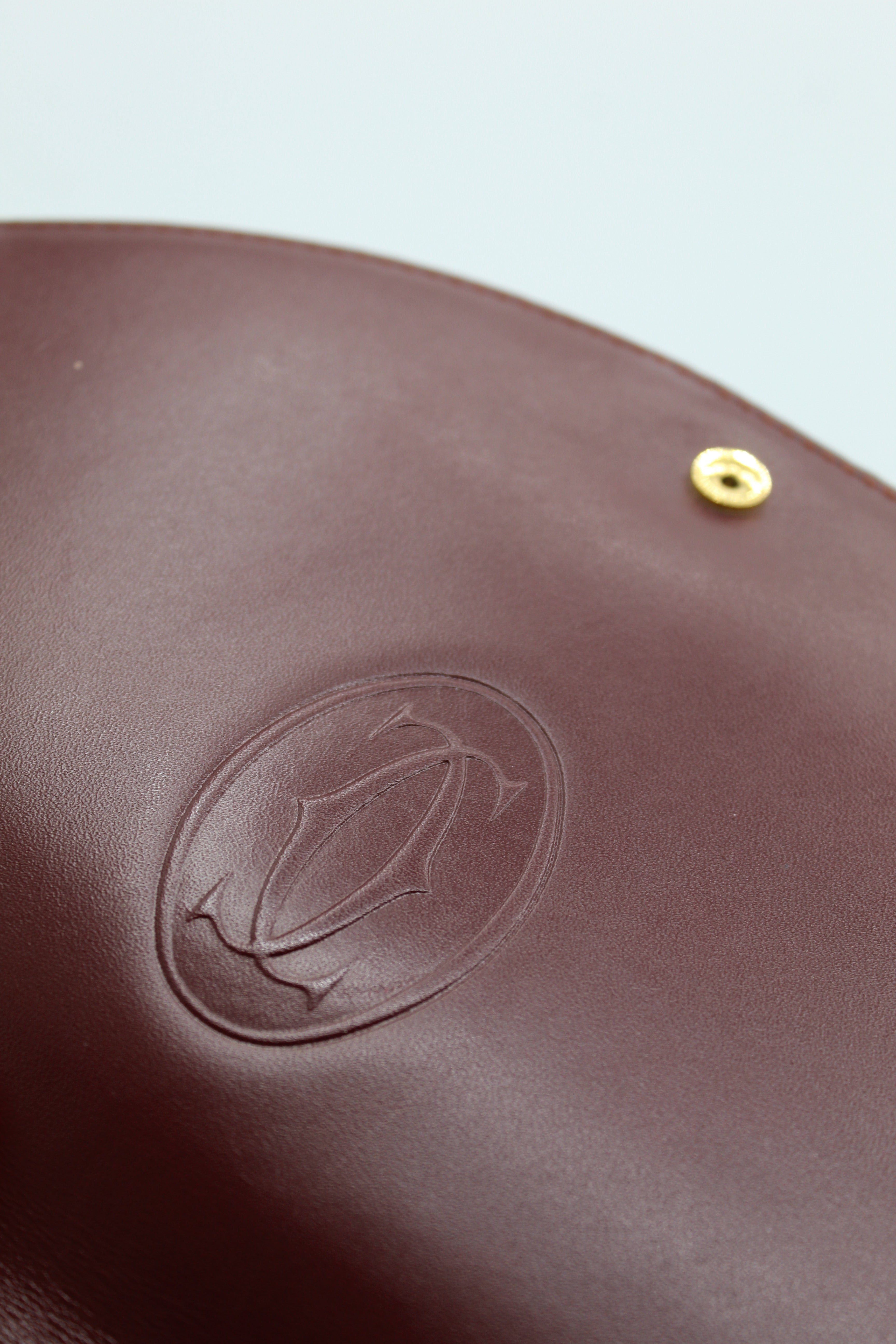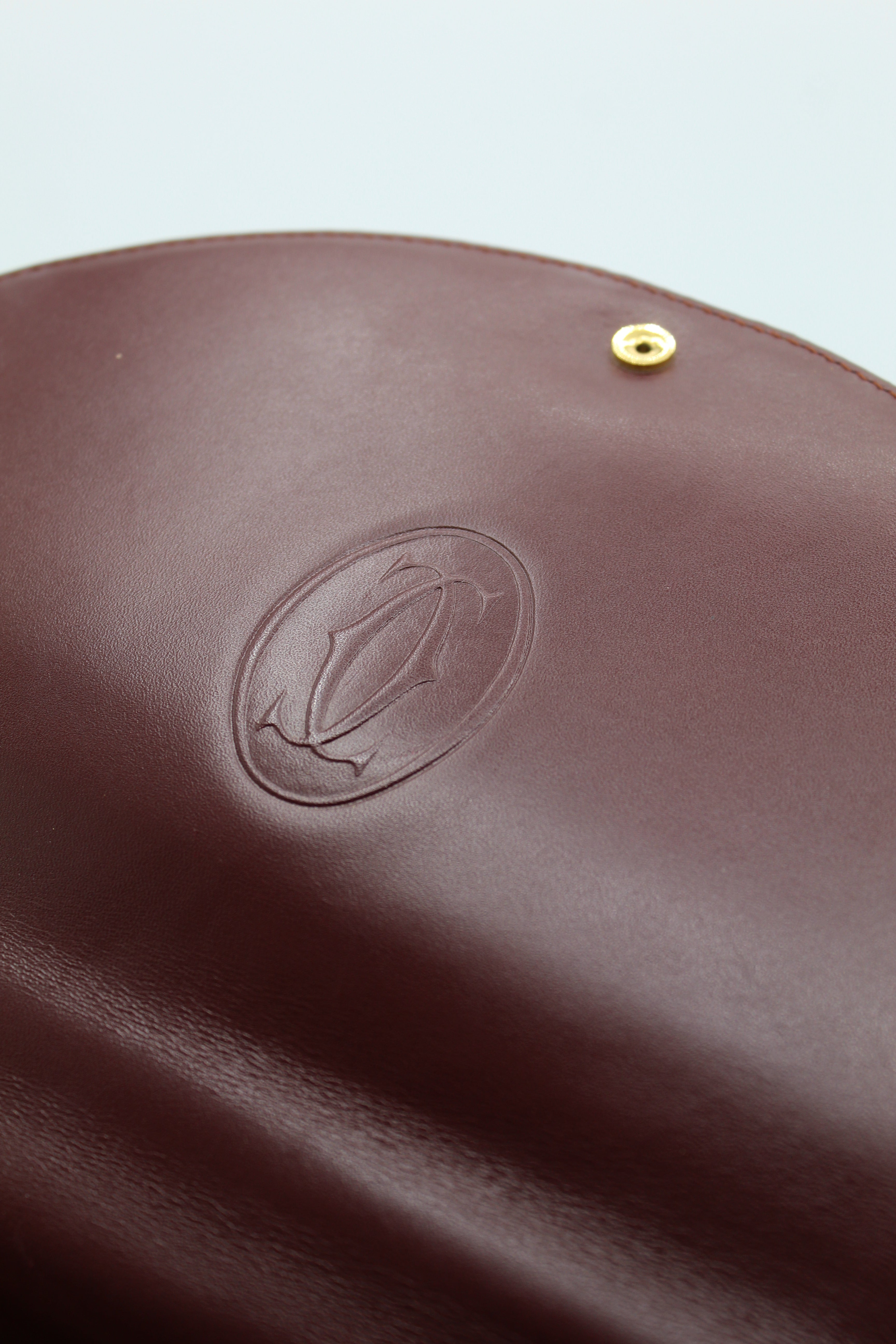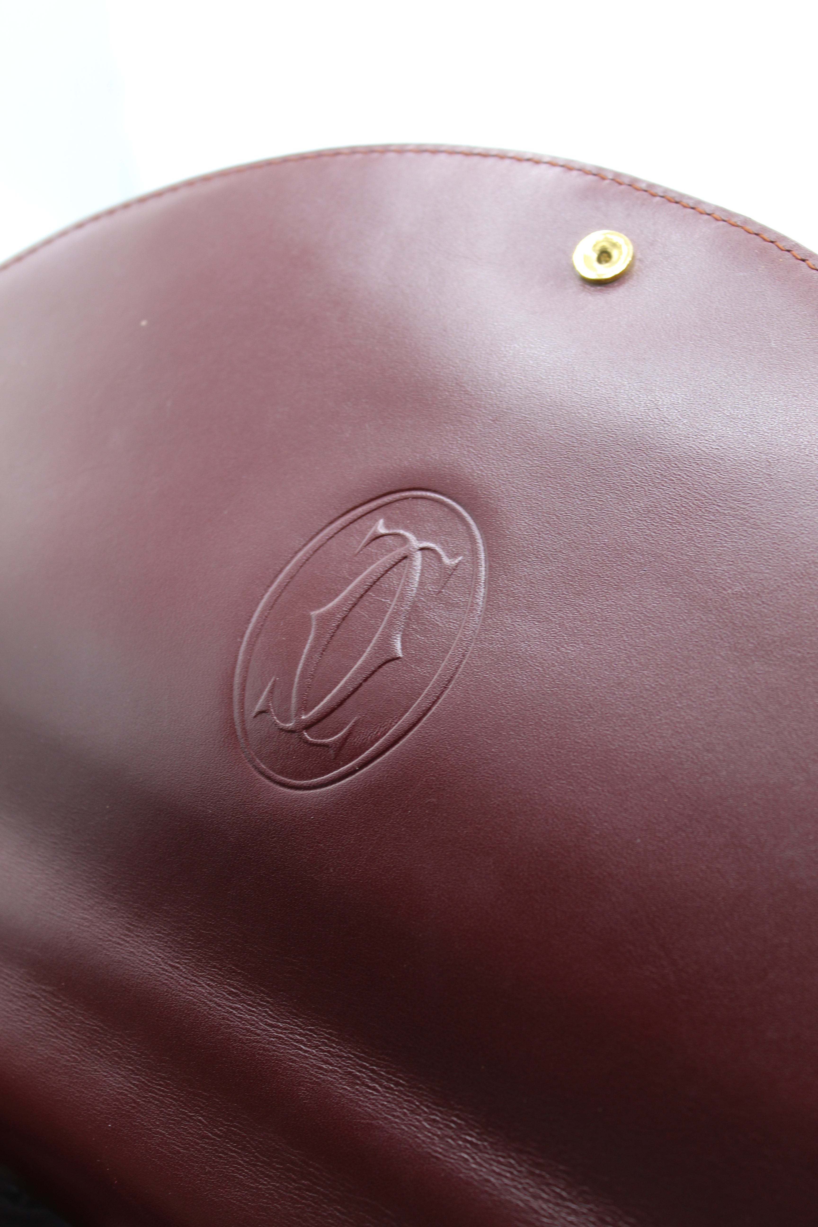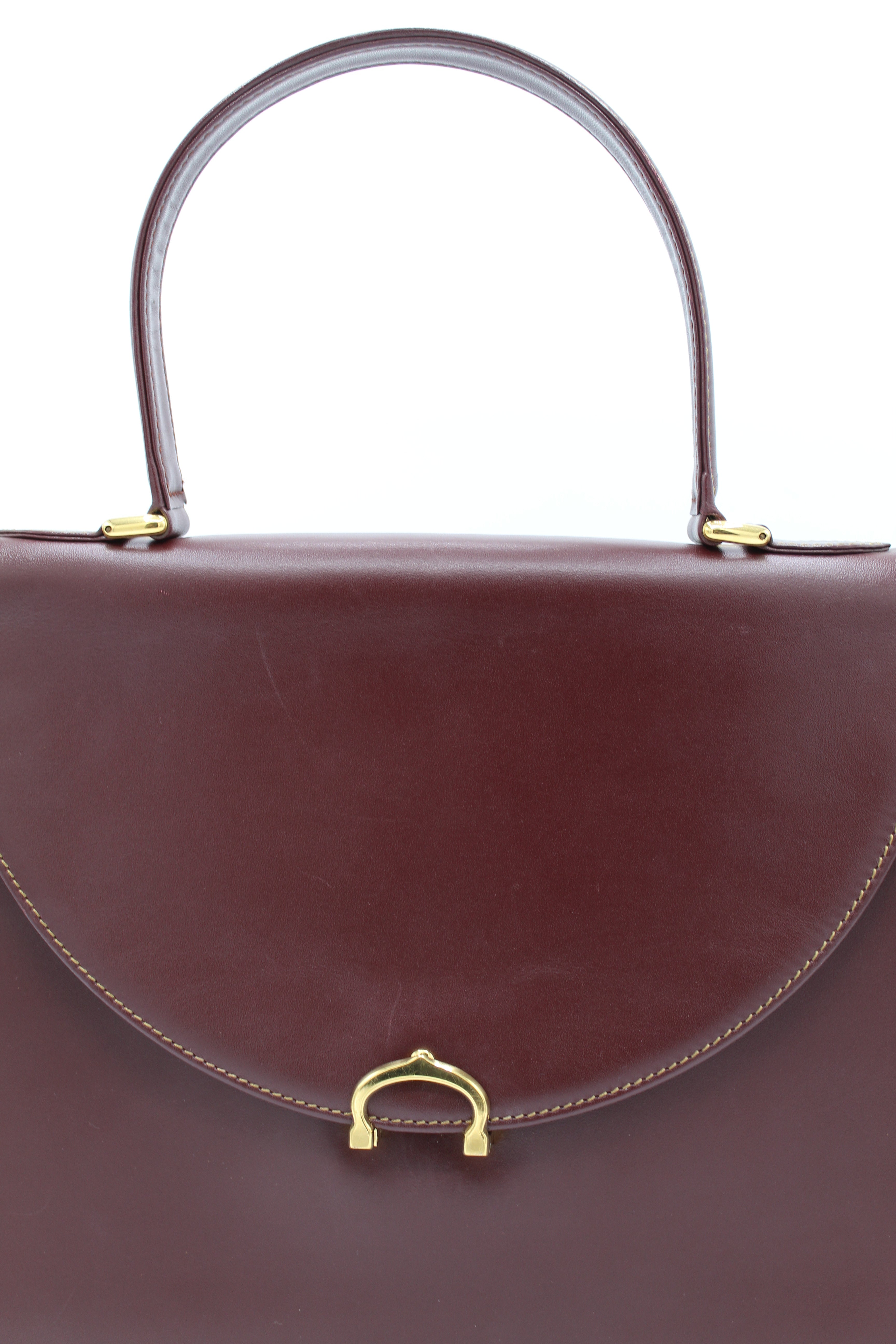 A refined vintage piece from Cartier’s Must de Cartier line, this structured top-handle bag is crafted from smooth burgundy leather and finished with elegant gold-tone hardware. The curved flap and signature clasp detail reflect the house’s timeless approach to luxury design.